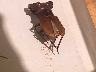 The little dust specks under the stag beetle are signs of a carpet-beetle infestation (Anthrenus spp.).